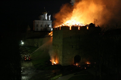 Информация о том, что на Власьевской башне Псковского кремля, где располагался ресторан "Белая Русь", загорелась кровля, поступила к спасателям 27 апреля в 23.27. Из-за сильного ветра огонь перекинулся на Рыбницкую башню.