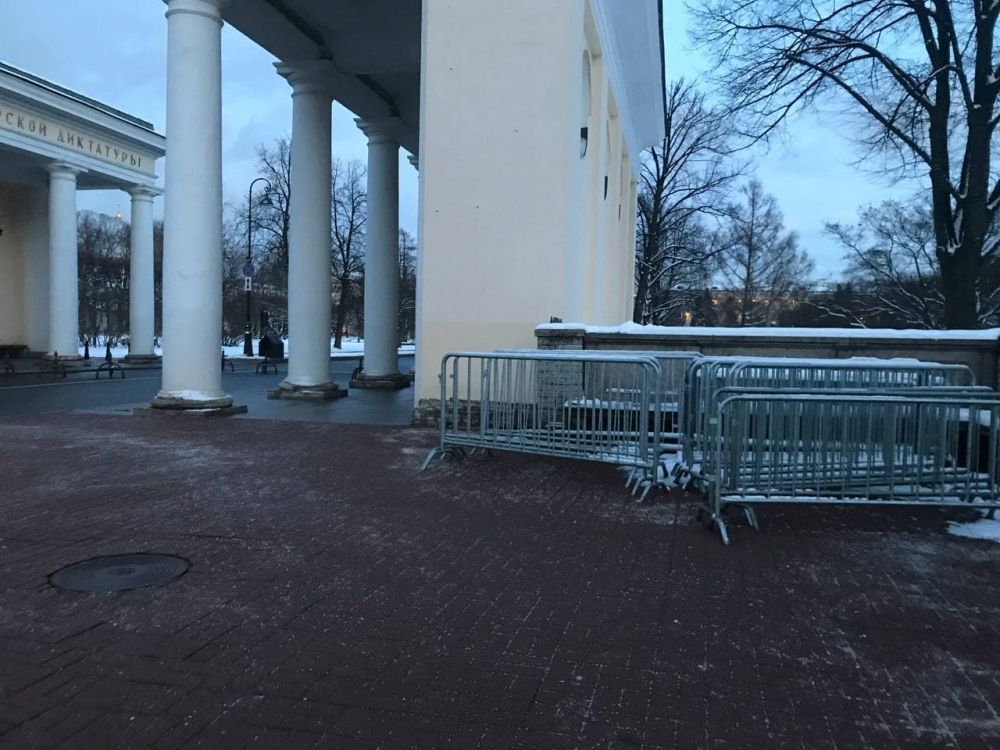 На подходах к Дворцовой площади тоже ждут своего часа заборы. С двух сторон огорожен тротуар вдоль Александровского сада со стороны главной городской площади, далее ограждений нет, как и у Сенатской площади. На ней 23 января собирались протестующие на акцию в поддержку арестованного оппозиционера Алексея Навального. Зато огорожен выход с тротуара на проезжую часть у Конституционного суда.