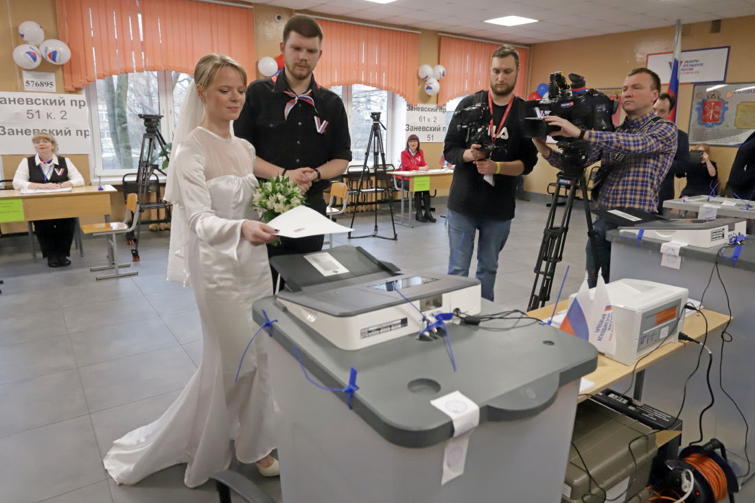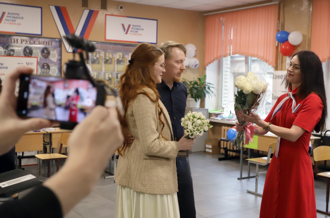 На второй день голосования на президентских выборах в Петербурге избирательный участок № 955 принял необычных гостей. На него приехали две пары молодоженов.