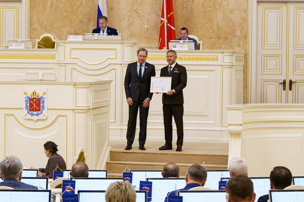 На заседании Заксобрания Петербурга 15 октября сенатор Андрей Кутепов вручил лидеру парламентской фракции "Единая Россия" благодарность председателя Совета Федерации Валентины Матвиенко, передает корреспондент ЗАКС.Ру. Спикер Совфеда отметила вклад депутата в совершенствование законодательства Петербурга и многолетнюю добросовестную работу. Документ подписан еще 1 июля 2025 года.