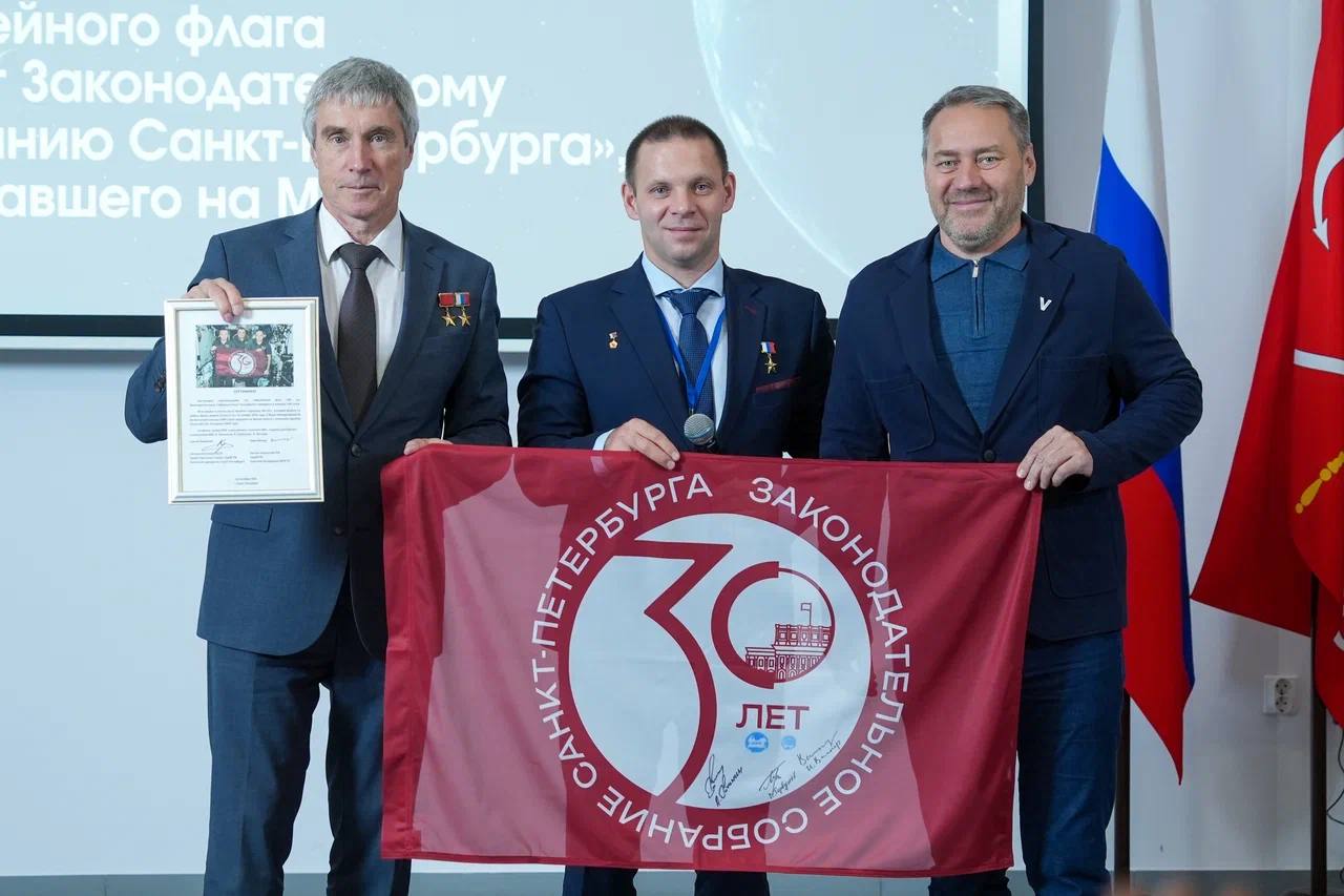 Летчики-космонавты Сергей Крикалёв и Иван Вагнер вручили спикеру Законодательного собрания Александру Бельскому побывавший на орбите флаг городского парламента, сообщил парламентарий 16 октября. Передача состоялась на торжественной церемонии открытия X форума "КосмоСтарт" в Музее космонавтики и ракетной техники имени В. П. Глушко на территории Петропавловской крепости.