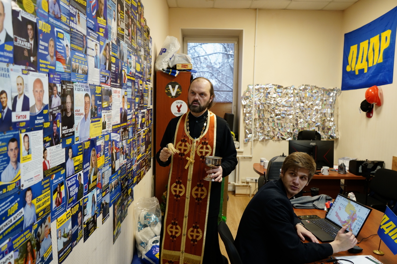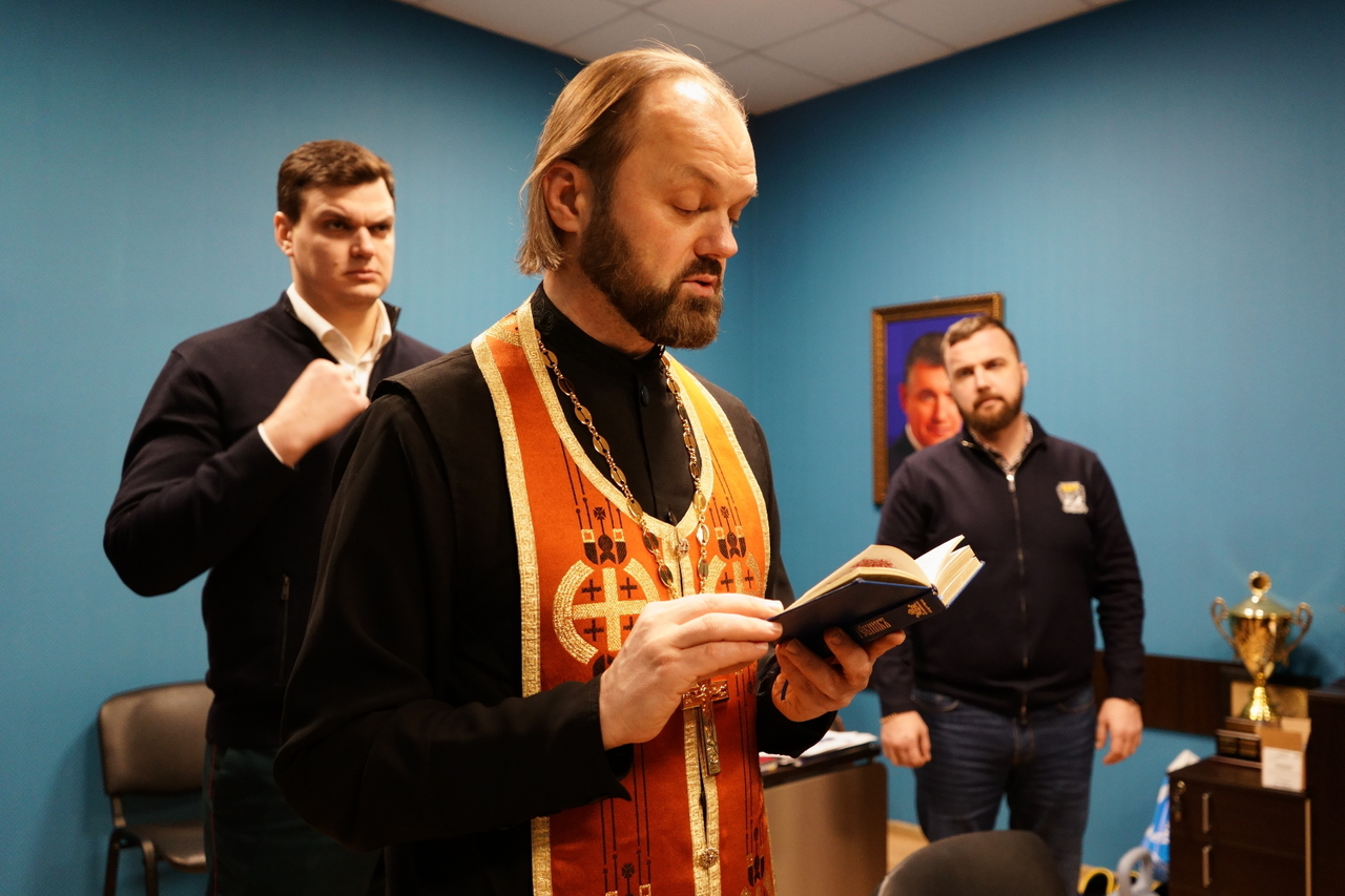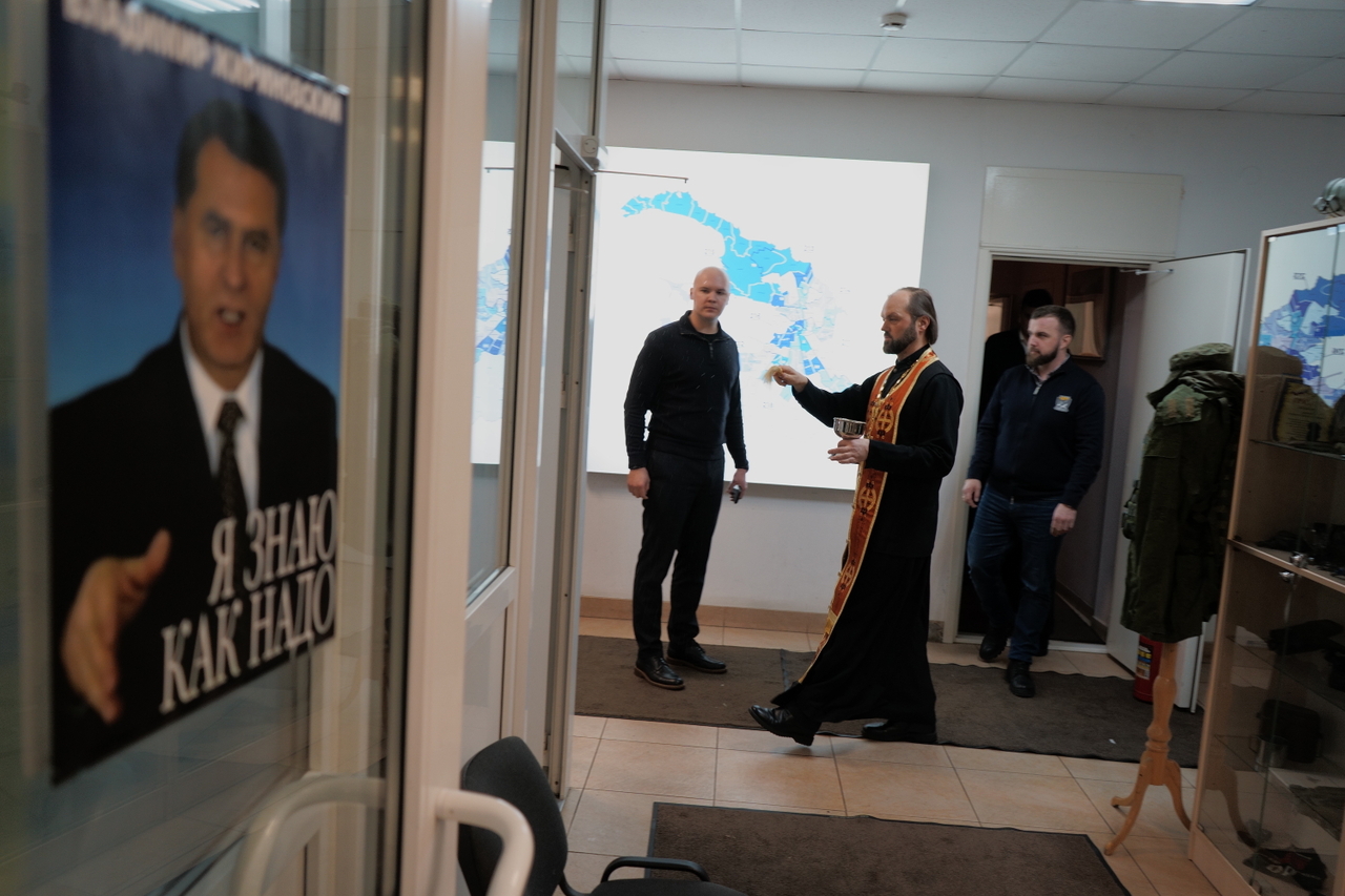 Перед церемонией собравшиеся помолились, а затем отец Илья вместе с партийцами прошел по всем помещениям и окропил их святой водой. Также священнослужитель разместил изображения креста на дверьми. Одну над главным входом в здание партотделения, а другую – над дверью в кабинет Ененкова.