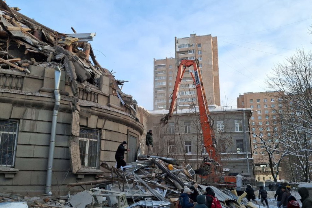 Утром 8 января рабочие с помощью строительной техники начали сносить здание 1950-х годов постройки. Градозащитное сообщество пыталось добиться сохранения здания около шести лет. Силовую поддержку рабочим оказывают неизвестные мужчины, которых организованной группой доставили на стройку утром. Они не давали местным жителям пройти на территорию здания. Тем не менее, судя по сообщениям градозащитников, днем им все же удалось пройти к строительной технике и добиться приостановки работ. Также на месте присутствуют сотрудники полиции. Они задержали члена незарегистрированной партии "Другая Россия Э.В. Лимонова" Кирилла Травкина.