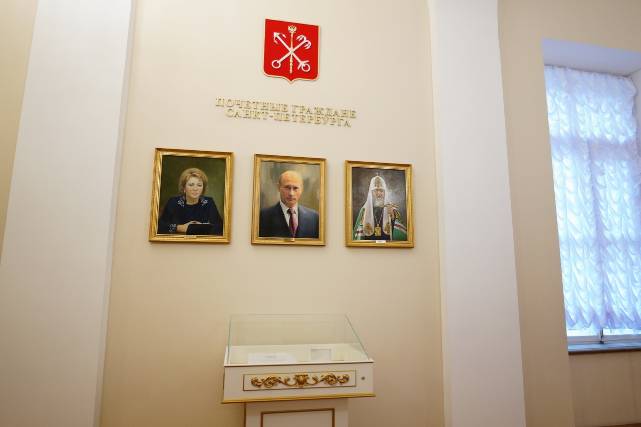 В Законодательном собрании Петербурга обновили галерею почетных граждан. Теперь самое видное место занимают портреты президента Владимира Путина, председателя Совета Федерации Валентины Матвиенко и главы Русской Православной церкви патриарха Кирилла. Раньше на этом месте располагались изображения поэтессы Ольги Берггольц, альпиниста-блокадника Михаила Боброва и академика Дмитрия Лихачева.