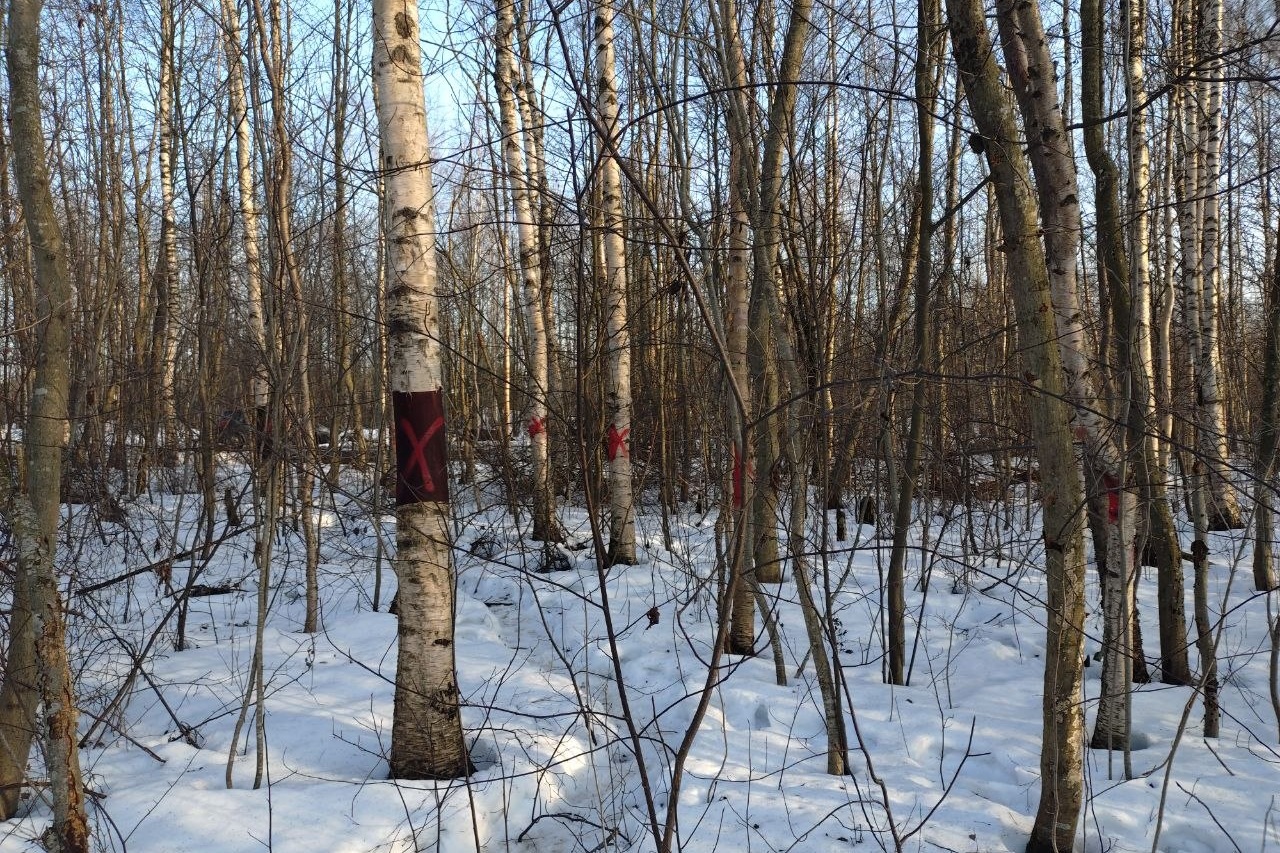 Чтобы попасть на место, достаточно отойти пару десятков метров от дороги на краю одного из расположенных здесь садоводств. На некоторых стволах по дороге краснеют жирные кресты — видимо, знаки предстоящего сноса. Пройдя мимо них, попадаешь на рукотворную полянку. На то, что еще недавно здесь был лес, недвусмысленно указывают вываленные то тут, то там распиленные бревна. Далее, за сохраненными деревьями, маячит просека. Она появилась здесь год назад, в тот раз на участке работала тяжелая техника, вспоминают местные жители.