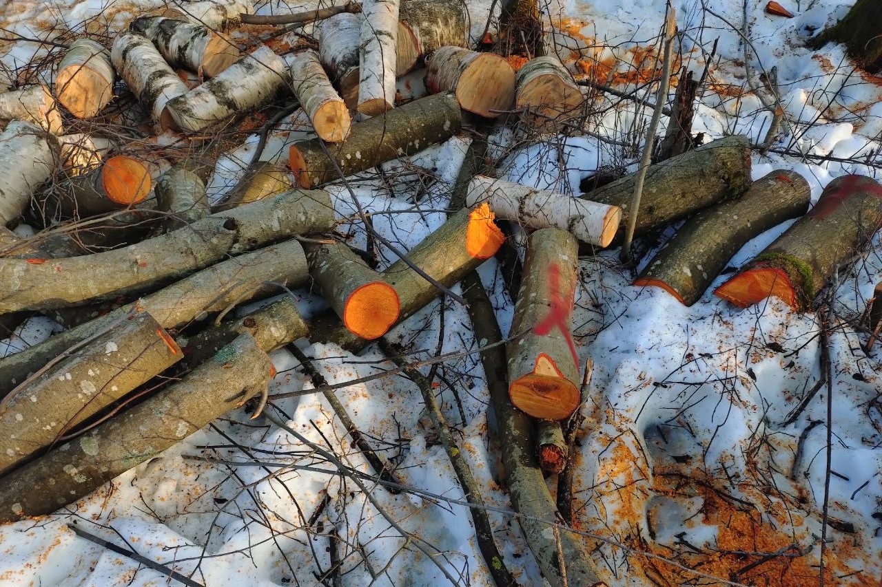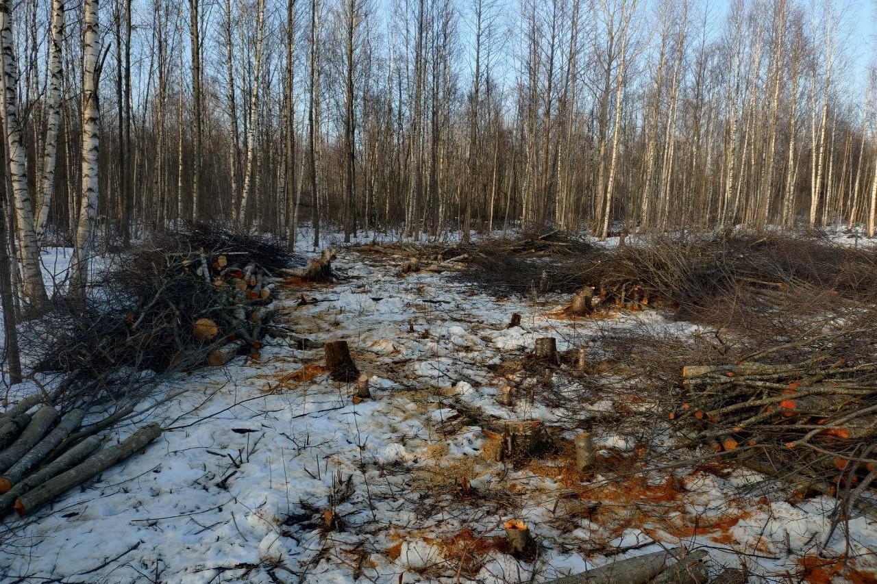 Не заметить вырубку никак нельзя. Во-первых, она находится на самом краю леса — прямо у дороги, которая фактически отделяет зеленую зону от расположенных здесь же садоводств. А во-вторых, слишком заметным стал результат.