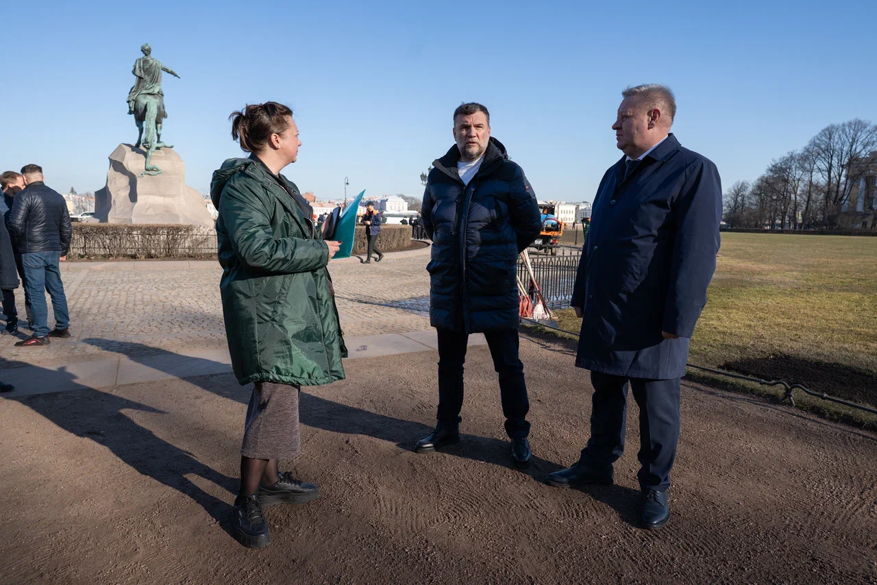 Во время осмотра хода работ Разумишкин и Петриченко прошлись по Александровскому саду и пообщались с представителями садово-парковых предприятий. Во время брифинга корреспондент ЗАКС.Ру поинтересовался у вице-губернатора о сроках уборки песка.