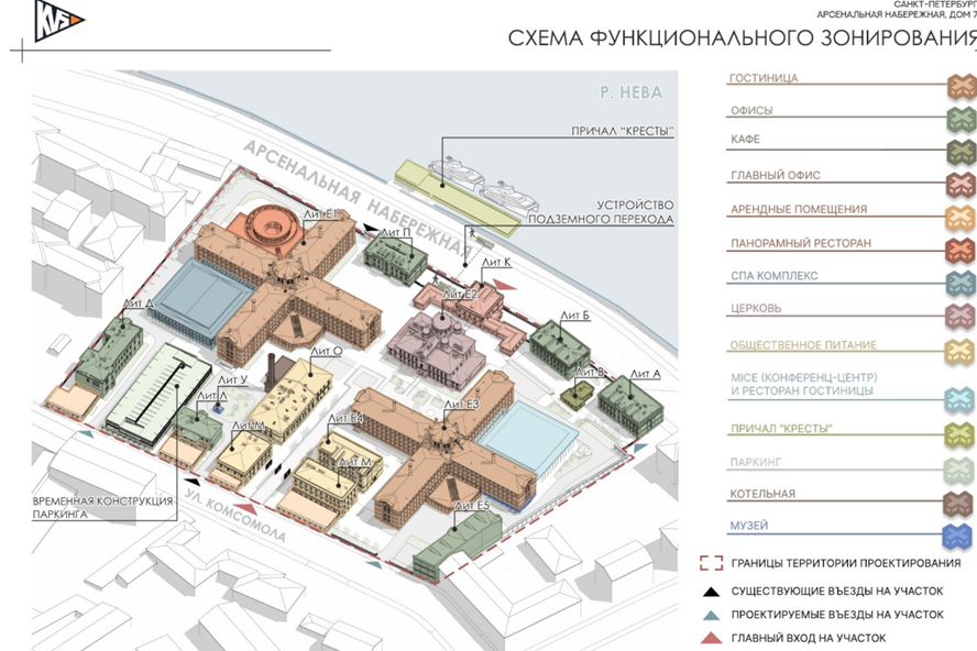 Напротив главного входа в "Кресты" построят причал, а справа от входа — подземный переход, его собираются провести под Арсенальной набережной. Пятизвездочная семейная гостиница и четырехзвездочный бизнес-отель планируют организовать в зданиях в форме крестов, передает "Деловой Петербург". Рядом с отелем построят ресторан с панорамным видом на Неву. С другой стороны здания откроется спа-салон. В центре комплекса собираются разместить церковь и главный офис девелопера "КВС". В рамках реставрации "Крестов" также планируют создать паркинг, коворкинги, арендные помещения, конференц-зал, построить кафе и рестораны.