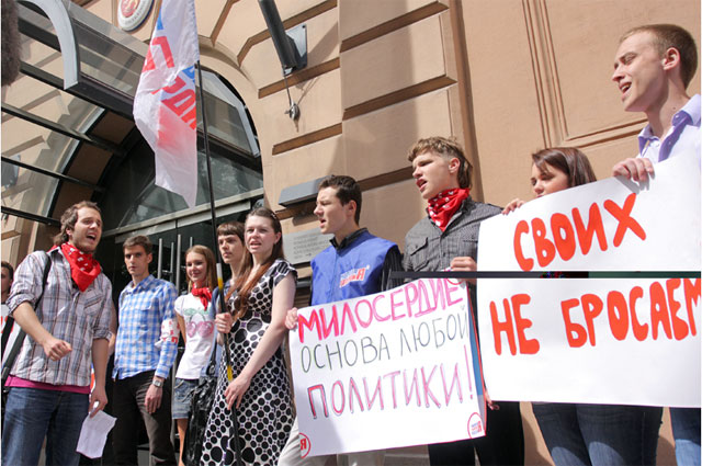 Как сообщает корреспондент ЗАКС.Ру, пикетировать консульство пришло около 20 человек. Они держали флаги и плакаты: "Милосердие — основа политики", "У матери есть права", "Своих не бросаем!" Эти же лозунги они и скандировали. Один из выступавших, Алексей Демьяненко, в своей речи сделал любопытное заявление: "У детей нет ни расы, ни пола", — сказал он.