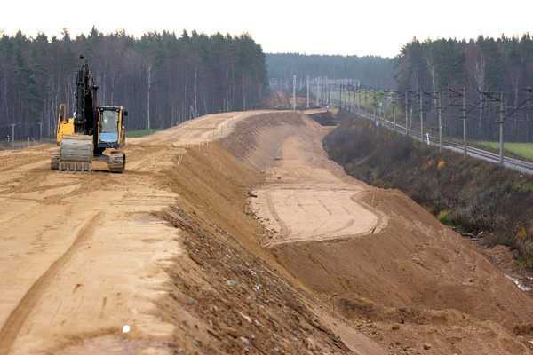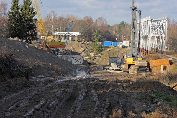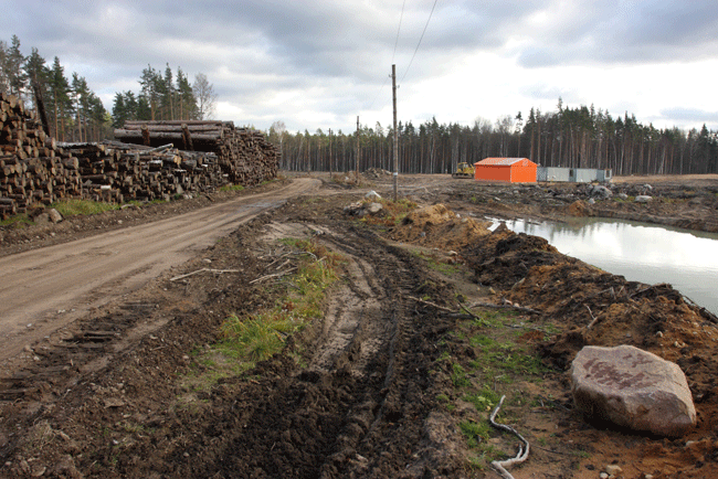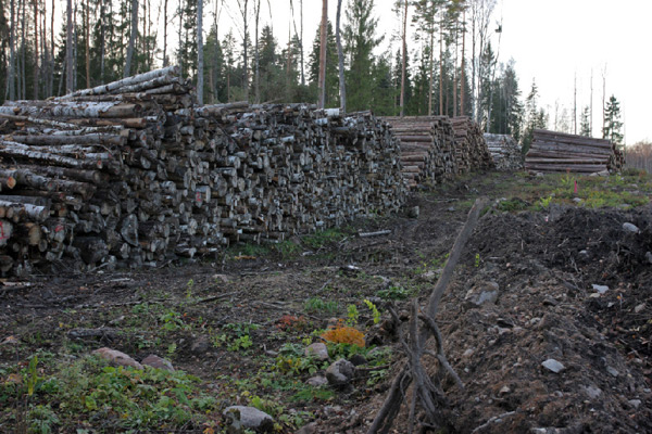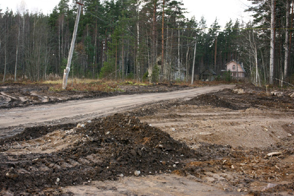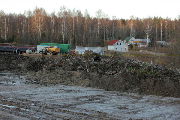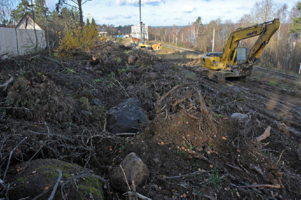 За Лосево практически на всем протяжении будущей трассы (65 км.) вплоть до Каменногорска тянется просека шириной до полукилометра, а местами и более. Лес под новую железную дорогу вырубили в течение этого года, теперь сложенная в штабеля древесина потихоньку гниет, вывозить ее никто не торопится. Дело в том, что заказчику строительства вырубленный лес не принадлежит, вывозить и реализовывать его должны государственные структуры, но какие – до конца не ясно.